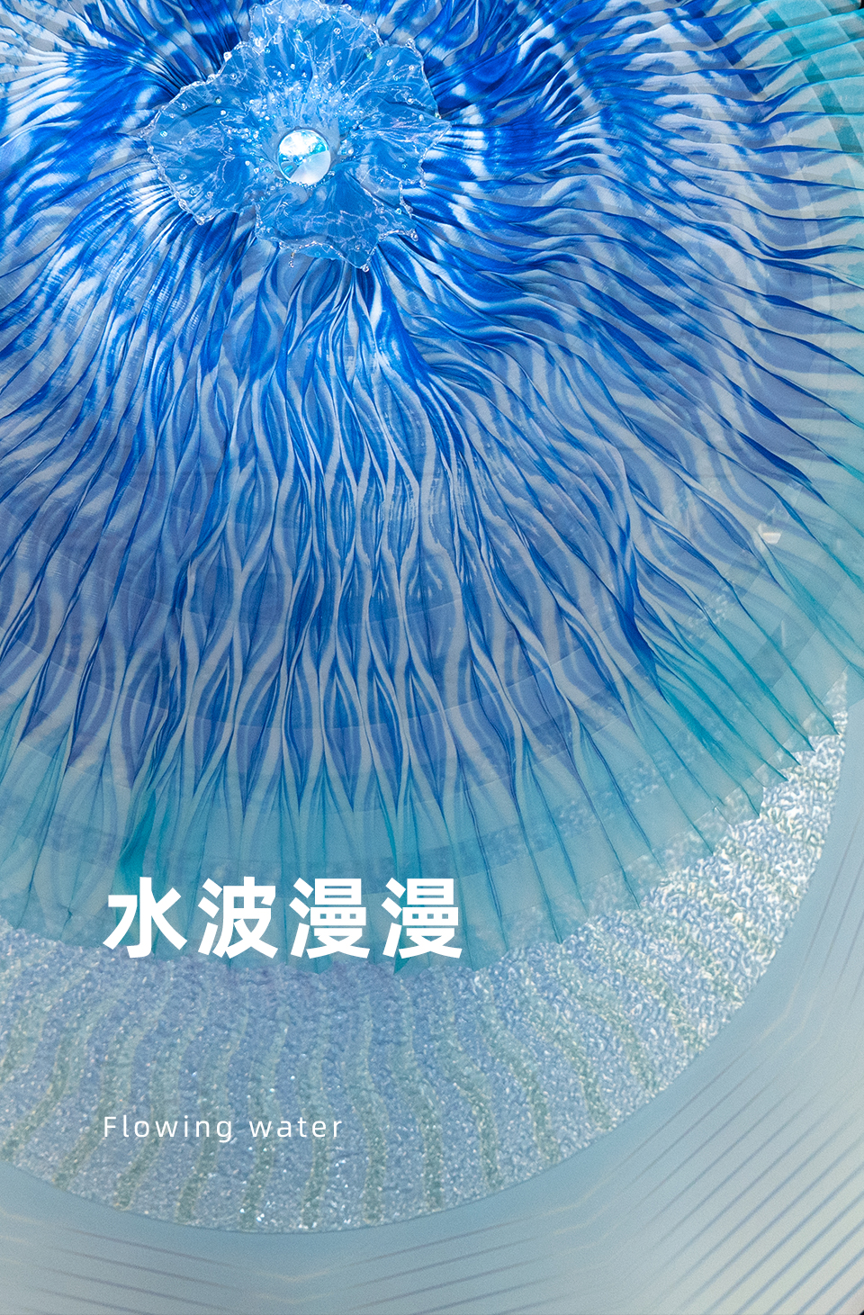在当今设计领域,中国传统图形符号纹样传承了华夏民族独有的艺术精神,在众多传统吉祥纹样中,水波纹颇具现代感,这种水文化深深扎根于艺术传承领域,不断影响着承载传统文化装饰纹样的创造。随着历史的发展,“水”的概念在艺术形式上富有了更多层次的底蕴内涵,视觉表现形式也更为百变多彩,此装置以“水”作为灵感源泉,从中抽象提炼出形成具有美感表现的纹样符号,进行扎染传统工艺与动态媒介结合的探索,对传统水波纹进行再创作,为人们提供了一个记忆的载体。
