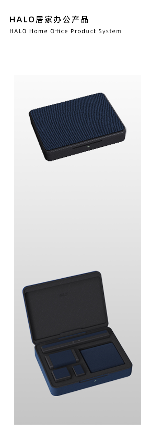 HALO是为远程居家办公群体设计的智能产品系统,以移动端为核心的设备组合,由屏幕灯、音箱、耳机、指环控制器、感知桌垫及便携式收纳盒六个模块组成。
