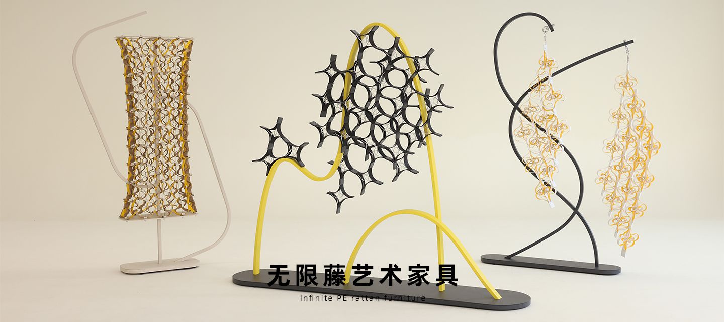设计师通过铁丝缠绕、挂线和交错编织的方法,将安抚物这一物体的特性运用于空 间面料中,并将其组装成可以互动与穿戴的软性空间装置。为服装的穿戴形式提供一种新的 尝试与可能性。
