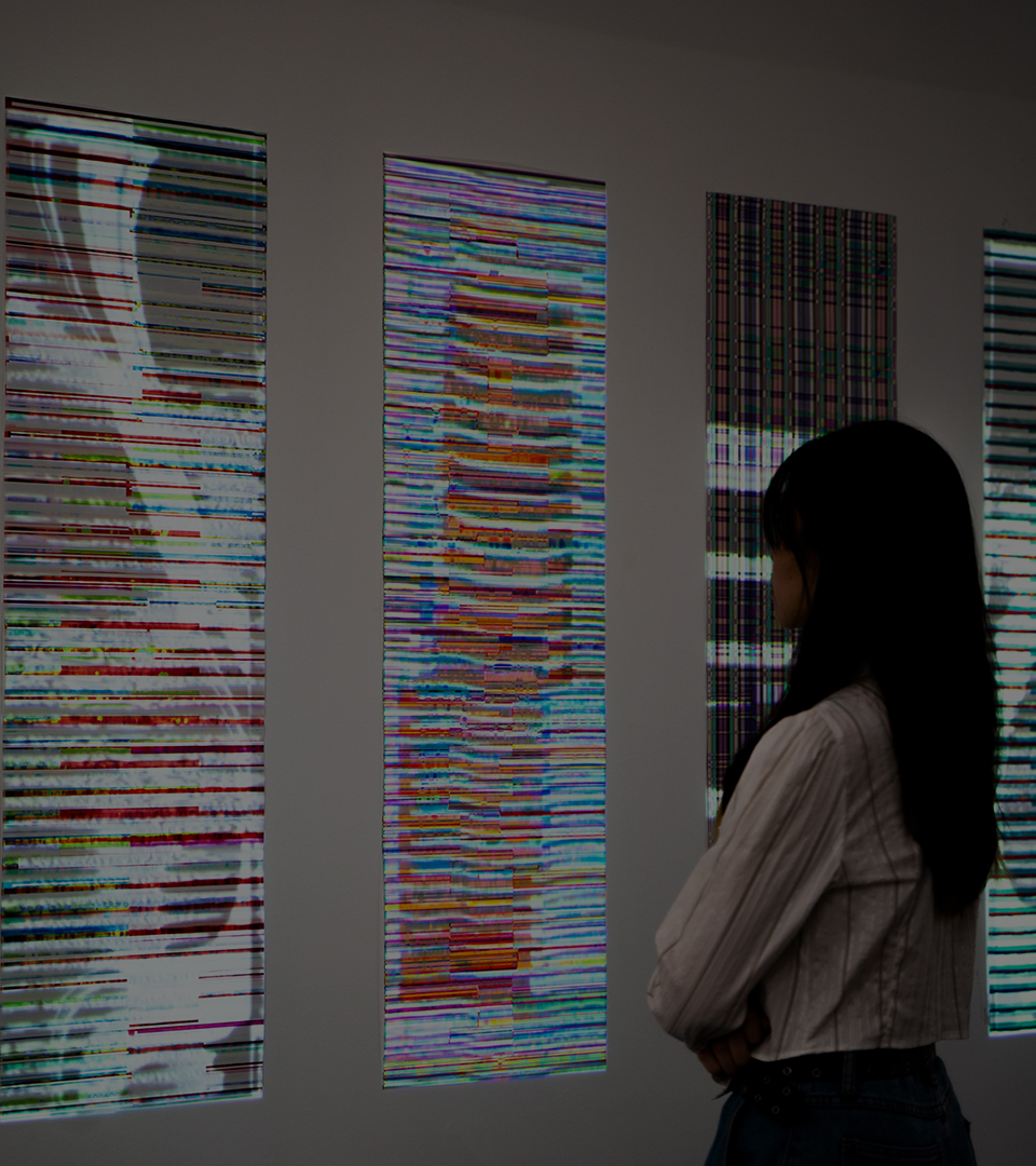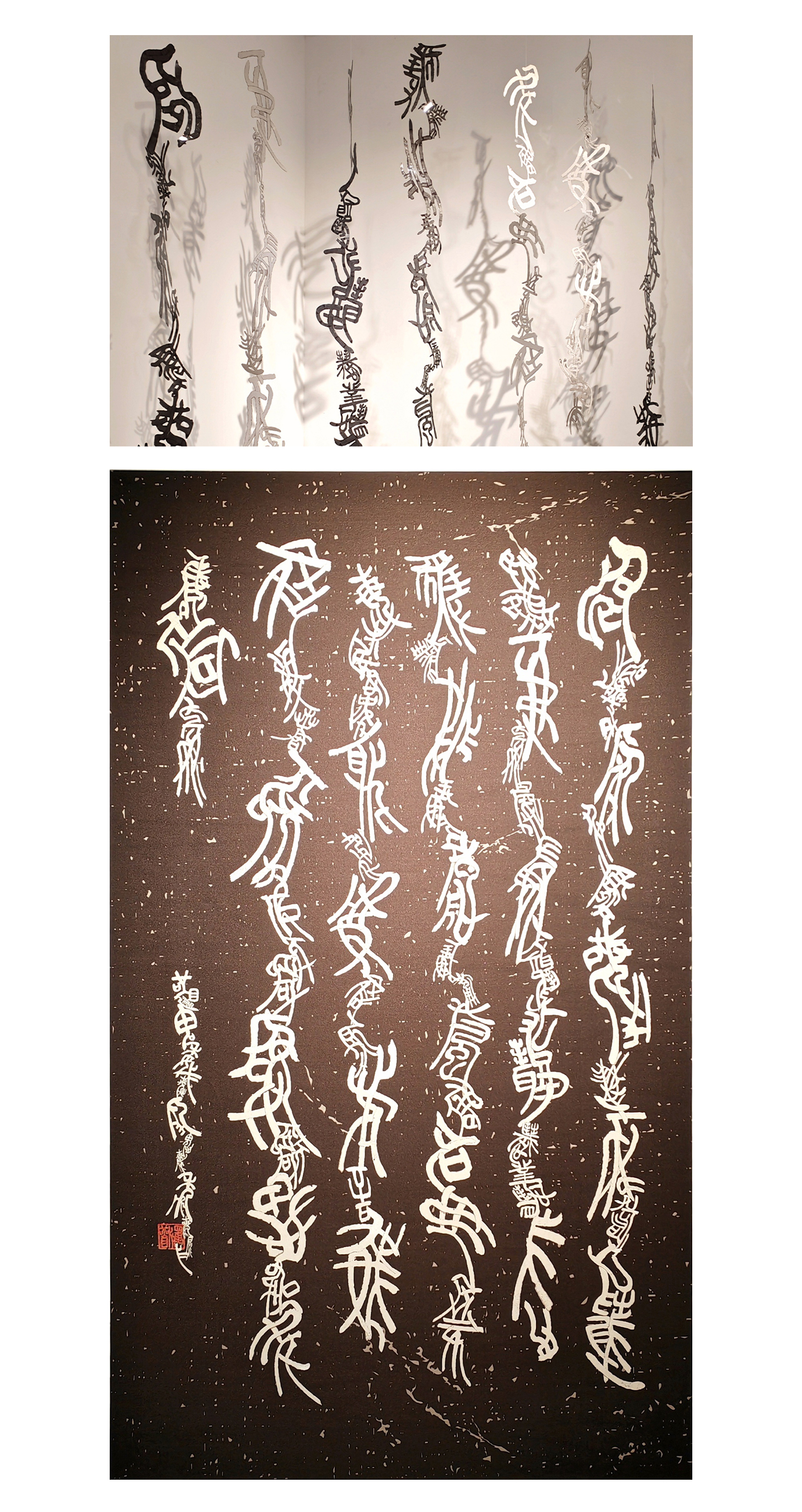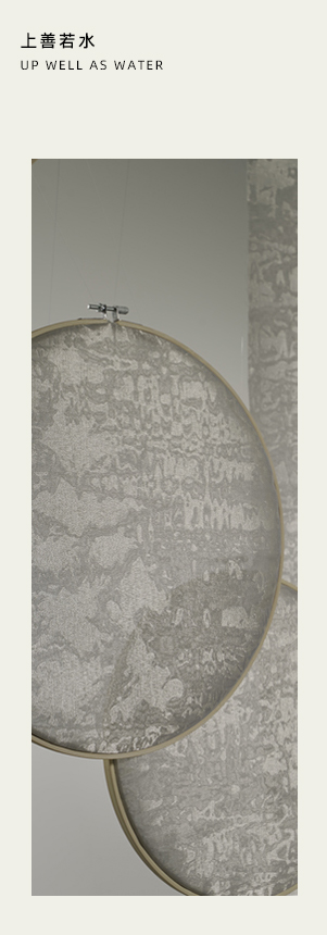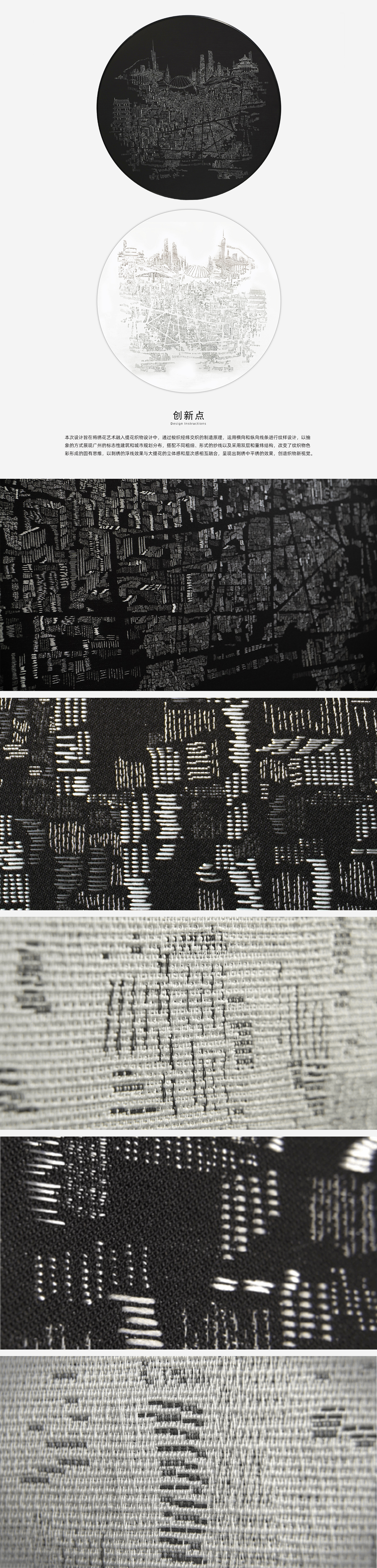 该作品以织物的人文艺术观赏性设计应用与实践为切入点,基于中国汉字繁简走向和古文字构型思维的发展,旨在通过大提花纹样设计和提花工艺的结合,回溯并捕捉篆书字体的线艺术之美;同时该作品亦予以观众与织物的互动空间和相由心生的哲理体验。