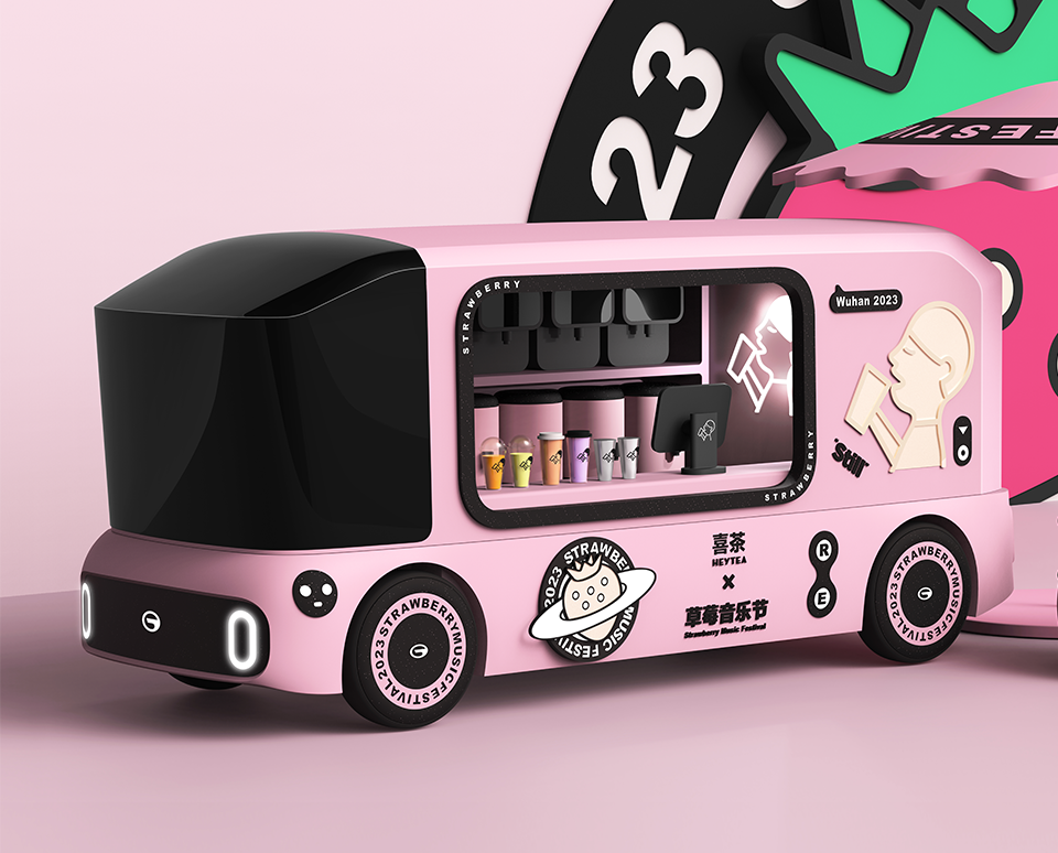 本案是对汽车平台化内外造型+个性化定制的复合型CMF设计探索,大胆融合三重品牌调性,MagicBox平台车内外中性格调、喜茶的时尚潮和草莓音乐节的特立独行,最终呈现“甜酷”复合冲击力。